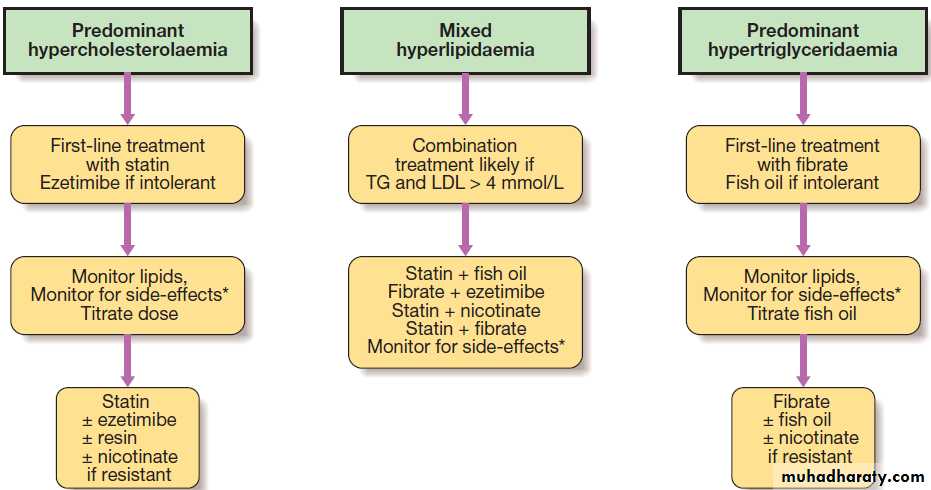 Drug treatment of hyperlipidaemia. *Interrupt treatment if CK is more than 5–10 times the upper limit of normal, or if elevated with muscle symptoms, or if ALT is more than 2–3 times the upper limit. To convert TG in mmol/L to mg/dL, multiply by 88.