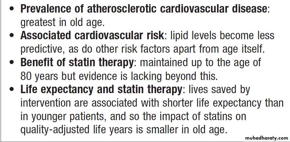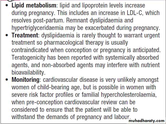 The principles of the management of dyslipidaemia can be applied broadly, but the objectives of treatment in the elderly and the safety of pharmacological therapy in pregnancy warrant special consideration.