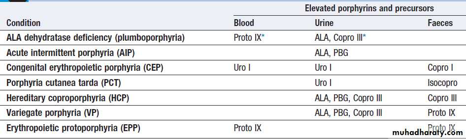 The diagnosis relied on the pattern of the porphyrins and porphyrin precursors found in blood, urine and faeces . This is a straightforward diagnosis at clinical presentation when the metabolites are significantly elevated, but this is not always the case in asymptomatic individuals. More recently, measurement of the enzymes that are deficient in the various porphyrias has provided further diagnostic information (for example, PBG deaminase activity in red blood cells to diagnose acute intermittent porphyria). However, there is often considerable overlap between enzyme activities in affected and normal subjects.Metabolite excretory patterns are always grossly