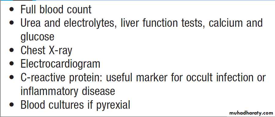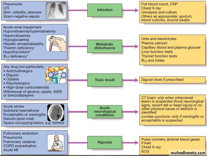 Fig. Common causes and investigation of delirium. All investigations are performed routinely, except those in italics. *Tend to present over weeks to months rather than hours to days. The chest X-ray shows consolidation in pneumonia.