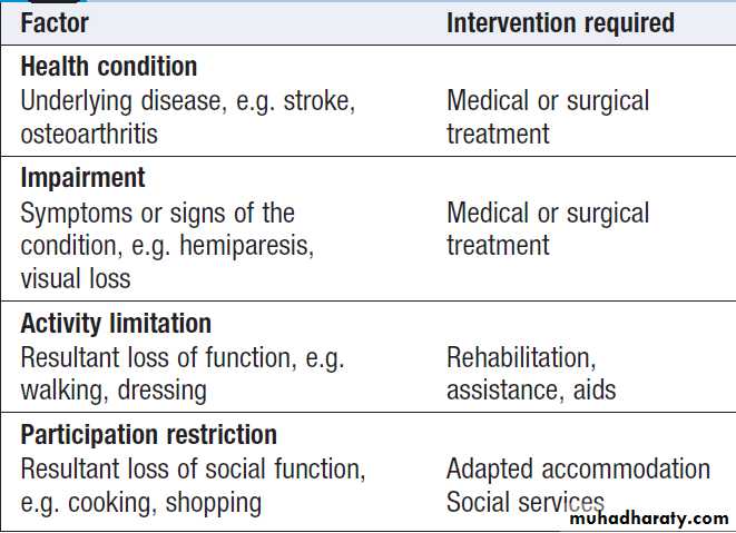 possible. Acute illness in old is often associated with loss of their usual ability to walk or care for themselves, and common disabling conditions such as stroke, fractured neck of femur, arthritis and cardiorespiratory disease become increasingly prevalent with advancing age. Disability is an interaction between factors intrinsic to the individual and the context in which they live. Doctors tend to focus on health conditions and impairments, but patients are more concerned with the effect on their activities and ability to participate in everyday life.