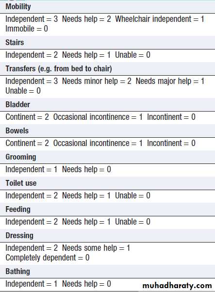 • Assessment. The nature and extent of the patient’s problems can be identified using the framework in Box . Specific assessment scales, such as the Elderly Mobility Scale or Barthel Index of Activities of Daily Living , are useful to quantify components of disability, but additional assessment is needed to determine the underlying causes or the interventions required in individual patients.