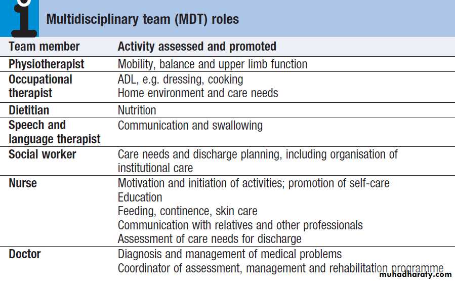 the multidisciplinary team . Others may be involved, e.g. audiometry to correct hearing impairment, podiatry for foot problems, and orthotics where a prosthesis or splinting is required. Good communication and mutual respect are essential. Regular team meetings allow sharing of assessments, agreement of rehabilitation goals and interventions, evaluation of progress and planning for the patient’s discharge home.