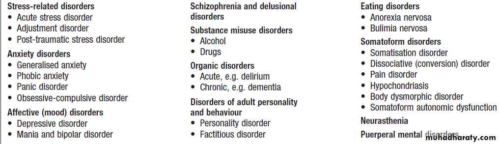 between mental and physical illness has become increasingly questionable. We therefore refer to psychiatric disorders simply to mean those conditions traditionally regarded as the province of psychiatry.