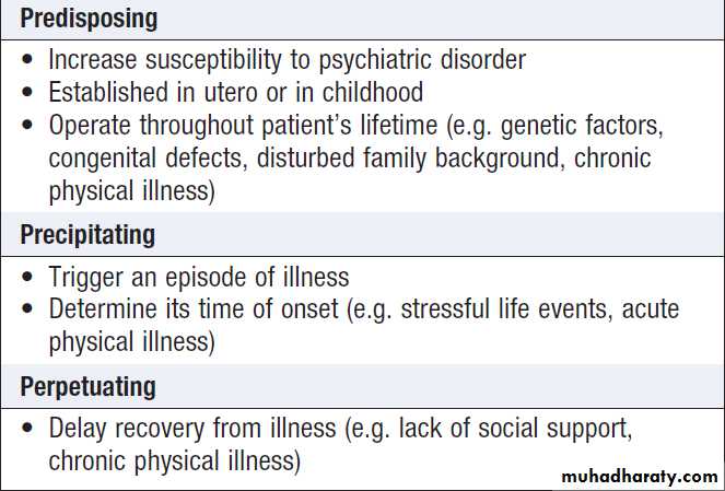 Predispose to the development of a disorder (e.g. excess alcohol intake leading to dependence, and dieting to anorexia) or perpetuate it.