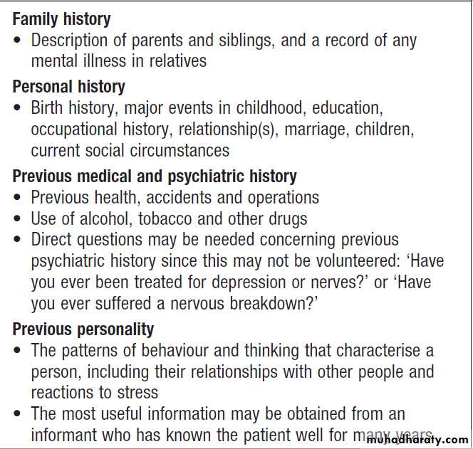 Because of its greater complexity, a full psychiatric history (Box) and detailed mental state examination (MSE) may take an hour or more. However, a brief mental state examination, usually taking no more than a few minutes (see below), should be part of the assessment of all patients, not merely those deemed to be ‘psychiatric’.