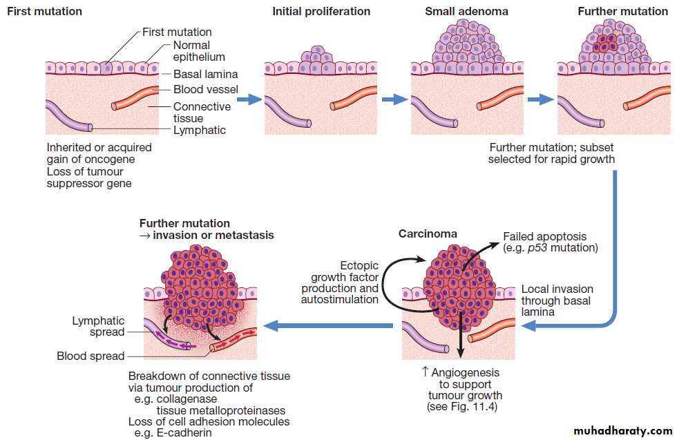Oncogenesis. The multistep origin of cancer, showing events implicated in cancer initiation, progression, invasion and metastasis.
