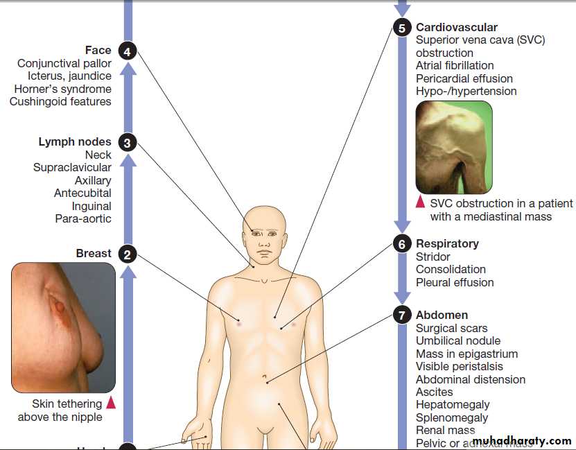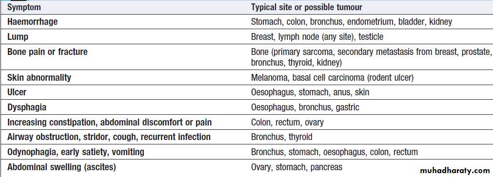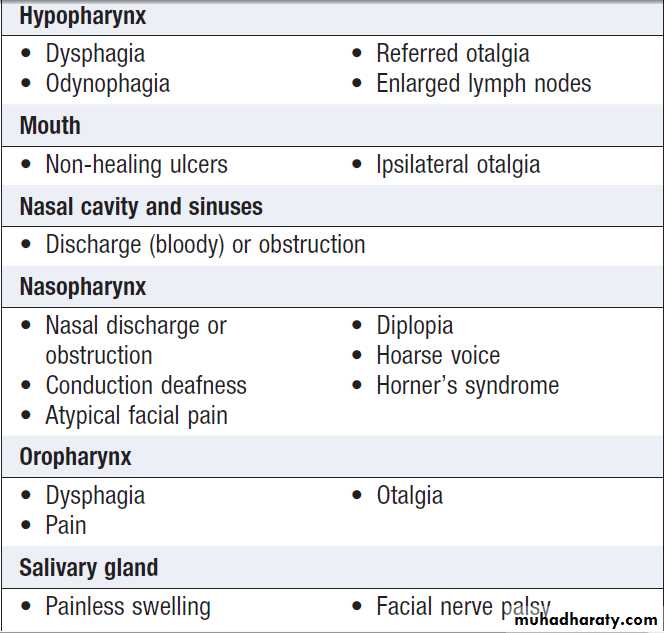 and the extent of disease. For example, early laryngeal cancers may present with hoarseness, while more extensive local disease may present with pain due to invasion of local structures or with a lump in the neck.