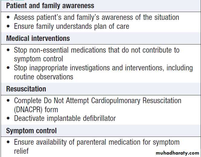 Once the conclusion has been reached that a patient isgoing to die in the next few days, there is a significant shift in management . Symptom control, relief of distress and care for the family become the most important elements of care. Medication and investigation are only justifiable if they contribute to these ends.