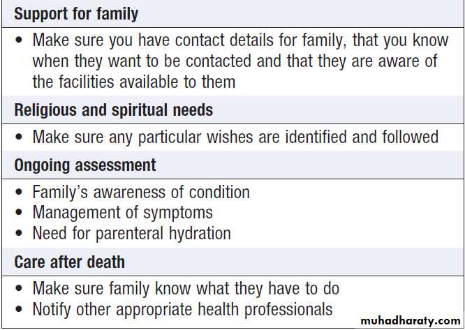 Doctors are sometimes poor at recognising this, and should be alert to the views of other members of the multidisciplinary team. A clear decision that the patient is dying should be agreed and recorded.