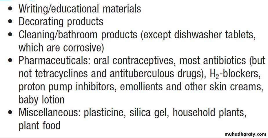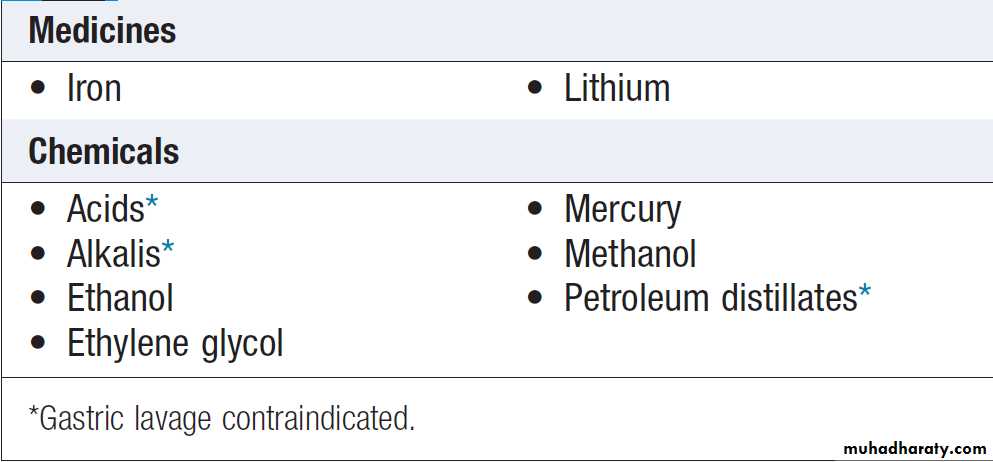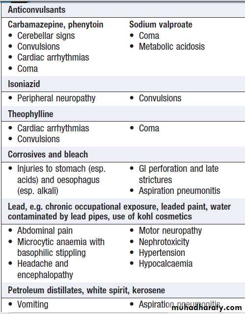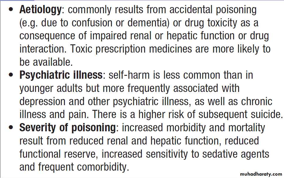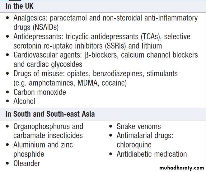 hospital admissions in the UK. In developed countries, the most frequent cause is intentional in the context of self-harm and usually involves ‘over-the-counter’ medicines. Accidental poisoning is also common, especially in children and the elderly (Box). Toxicity also may occur as a result of alcohol or recreational substance use, or following occupational or environmental exposure. Poisoning is a major cause of death in young adults, but most deaths occur before patients reach medical attention, and mortality is much <1% in those admitted to hospital. In developing countries, the frequency of self-harm is more difficult to estimate. Household and agricultural products, such as pesticides and herbicides, are common sources of poisoning and are associated with a much higher case fatality.Important substances involved in poisoning