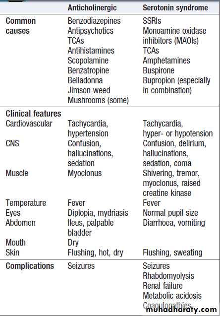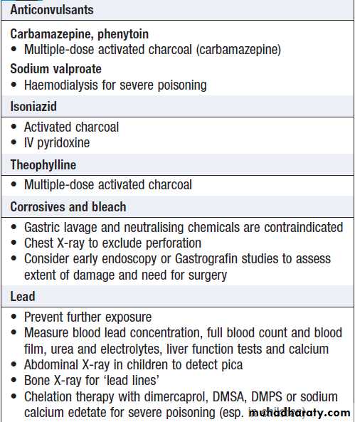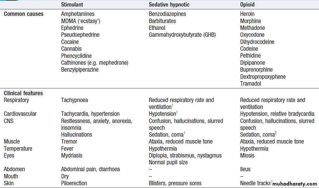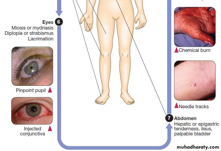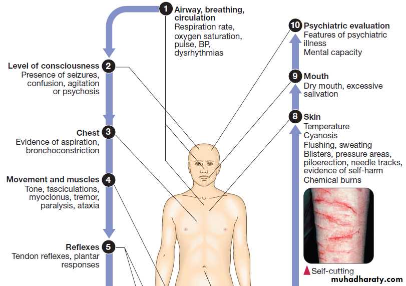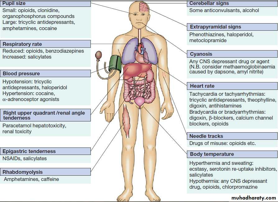 Clinical assessment and investigationsHistory and examination described above.Occasionally, patients may be unaware or confused about what they have taken, or may exaggerate (or less commonly underestimate) the size of the overdose, but rarely mislead medical staff deliberately. In regions of the world where self-poisoning is illegal, patients may be reticent about giving a history. Toxic causes of abnormal physical signs are shown above.The patient may have a cluster of clinical
