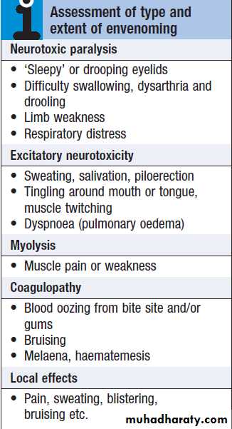 signs that may indicate the type and extent of envenoming Specific tests for venom are currently only commercially