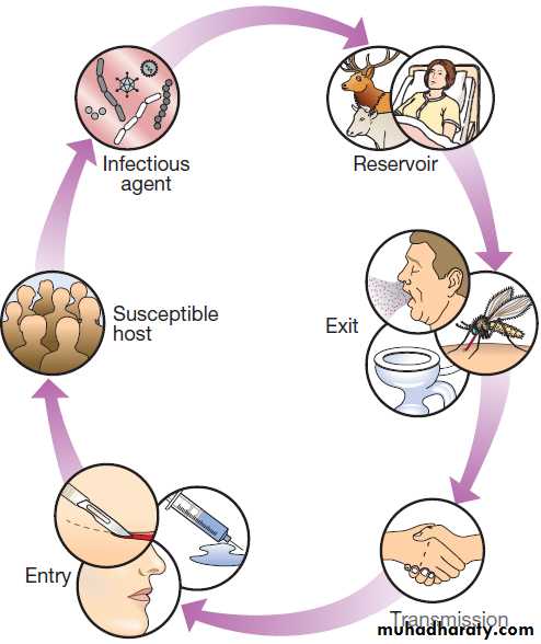 causes the disease. The reservoir is the place where the population of an infectious agent is maintained. The portal of exit is the point from which the infectious agent leaves the reservoir. Transmission is the process by which the infectious agent is transferred from the reservoir to the humanhost, either directly or via a vector or fomite. The portal of entry is the body site that is first accessed by the infectious agent. Finally, in order for disease to ensue, the person to whom the infectious agent is transmitted must be a susceptible host.
