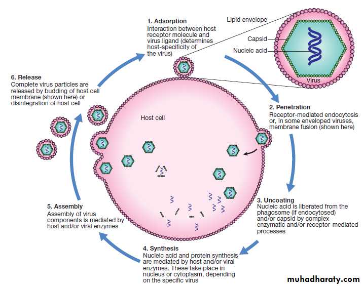Fig. A generic virus life cycle. Life cycle components common to most viruses are host cell attachment and penetration, virus uncoating, nucleic acid and protein synthesis, virus assembly and release. Virus release is achieved either by budding, as illustrated, or by lysis of the cell membrane. Life cycles vary between viruses.