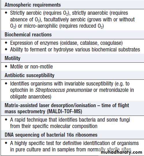 • Effect on culture media (e.g. β-haemolysis of blood agar inhaemolytic streptococci