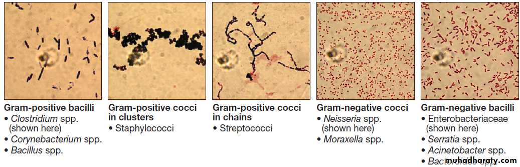 Gram stain reaction• Gram-positive (thick peptidoglycan layer), Gram-negative (thin peptidoglycan) or unstainable