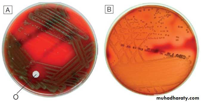 A Alpha-haemolytic streptococci. The colonies cause partial haemolysis, which imparts a green tinge to the agar. The organism shown is Strep. pneumoniae from the cerebrospinal fluid of a patient with meningitis (note also the susceptibility to optochin (O), which is another feature used to identify this organism).B Beta-haemolytic streptococci. The colonies cause complete haemolysis, which renders the agar transparent. The organism shown is Strep. pyogenes (group A