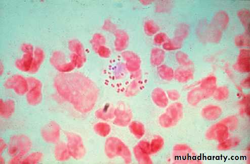 gonococcal urethritis. Gram-negative diplococci are seen within polymorphonuclear leucocytes.Management