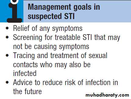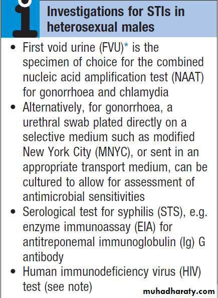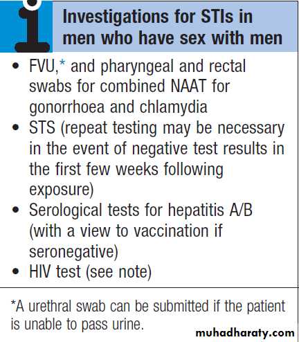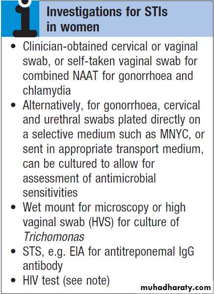 seen frequently, GUM clinics routinely offer a full set ofinvestigations at the patient’s first visit , regardless of the reason for attendance. In other settings, less comprehensive investigation may be appropriate.