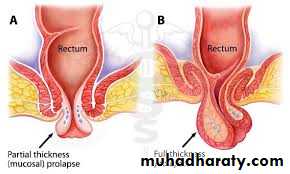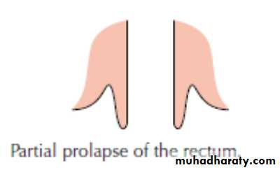 • The mucous membrane and submucosa of the rectum protrude outside the anus for approximately 1–4 cm. When the prolapsed mucosa is palpated between the finger and thumb, it is evident that it is composed of no more than a double layer of mucous membrane (cf. full-thickness prolapse).