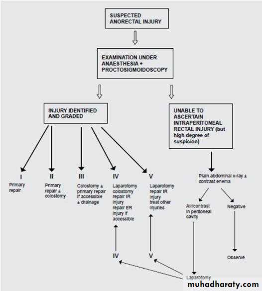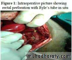 If perforation is suspected, the rectum is examined under general anaesthetic with a finger and a speculum, particular attention being directed to the anterior wall.If penetrating injury is confirmed, lower laparotomy is then performed. If an intraperitoneal rupture of the rectum is found, the perforation is closed with sutures. After closing the laparotomy wound, a defunctioning colostomy is usually required, constructed in the left iliac fossa.
