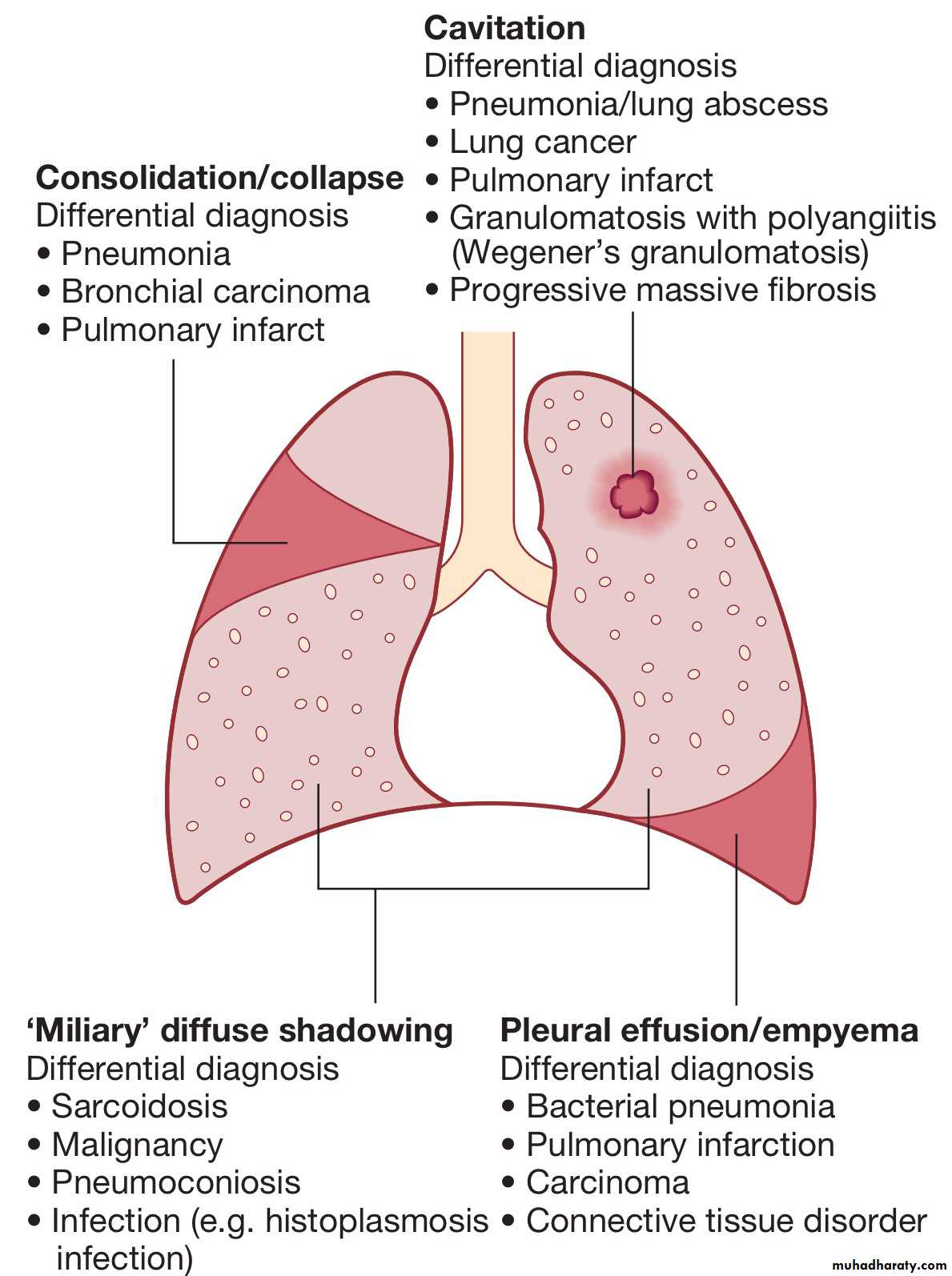 Radiological changes include ill-defined opacification in one or both of the upper lobes, and as progression occurs, consolidation, collapse and cavitation develop to varying degrees.