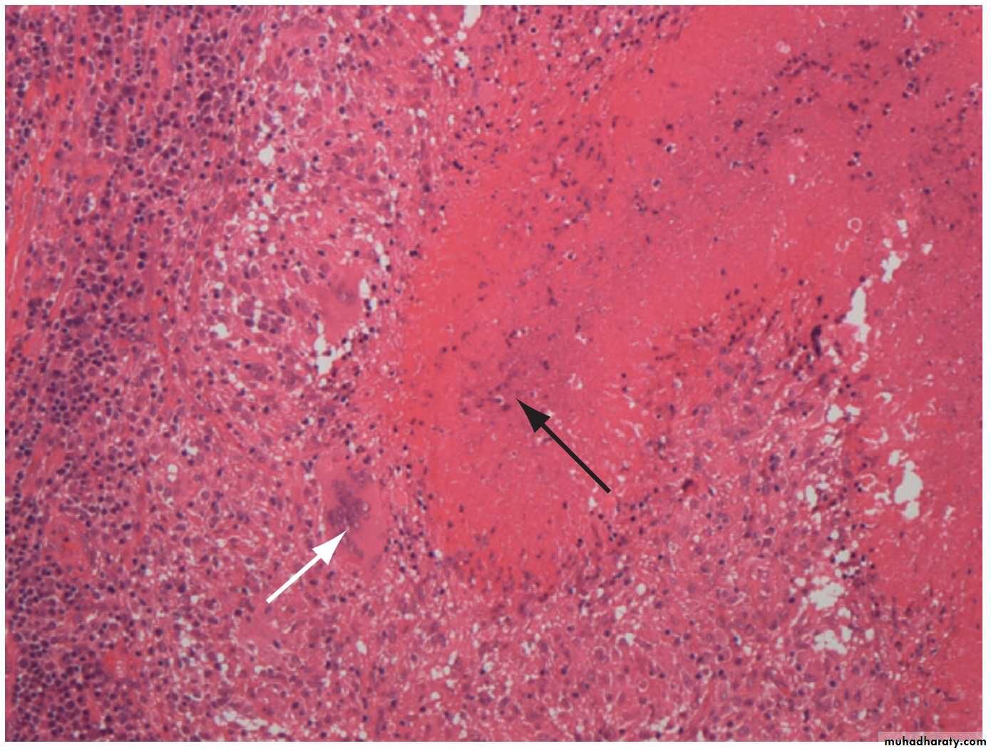 Normal lung tissue is lost and replaced by a mass of fibrous tissue with granulomatous inflammation characterised by large numbers of macrophages and multinucleate giant cells (white arrow). The central area of this focus shows caseous degeneration (black arrow).Numerous granulomas aggregate to form a primary lesion or ‘Ghon focus’ (a pale yellow, caseous nodule, usually a few millimetres to 1–2 cm in diameter), which is characteristically situated in the periphery of the lung.