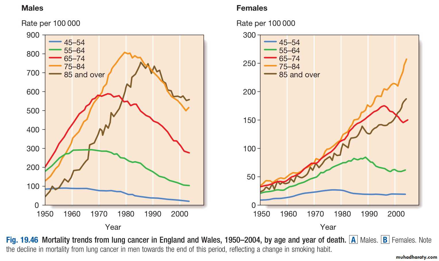 The incidence of lung cancer is slightly higher in urban than in rural dwellers, which may reflect differences in atmospheric pollution (including tobacco smoke) or occupation.