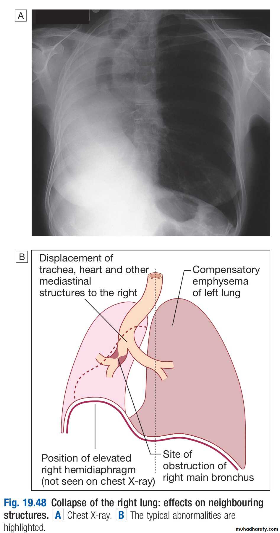 Complete obstruction causes collapse of a lobe or lung, with breathlessness, mediastinal displacement and dullness to percussion with reduced breath sounds.