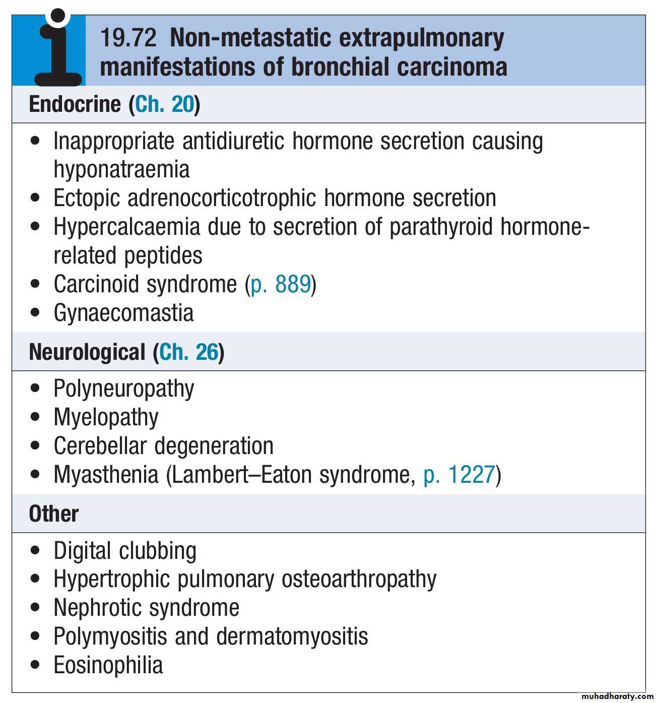 The syndrome of inappropriate antidiuretic hormone secretion and ectopic adrenocorticotrophic hormone secretion are usually associated with small-cell lung cancer.Hypercalcaemia may indicate malignant bone destruction or production of hormone-like peptides by a tumour.
