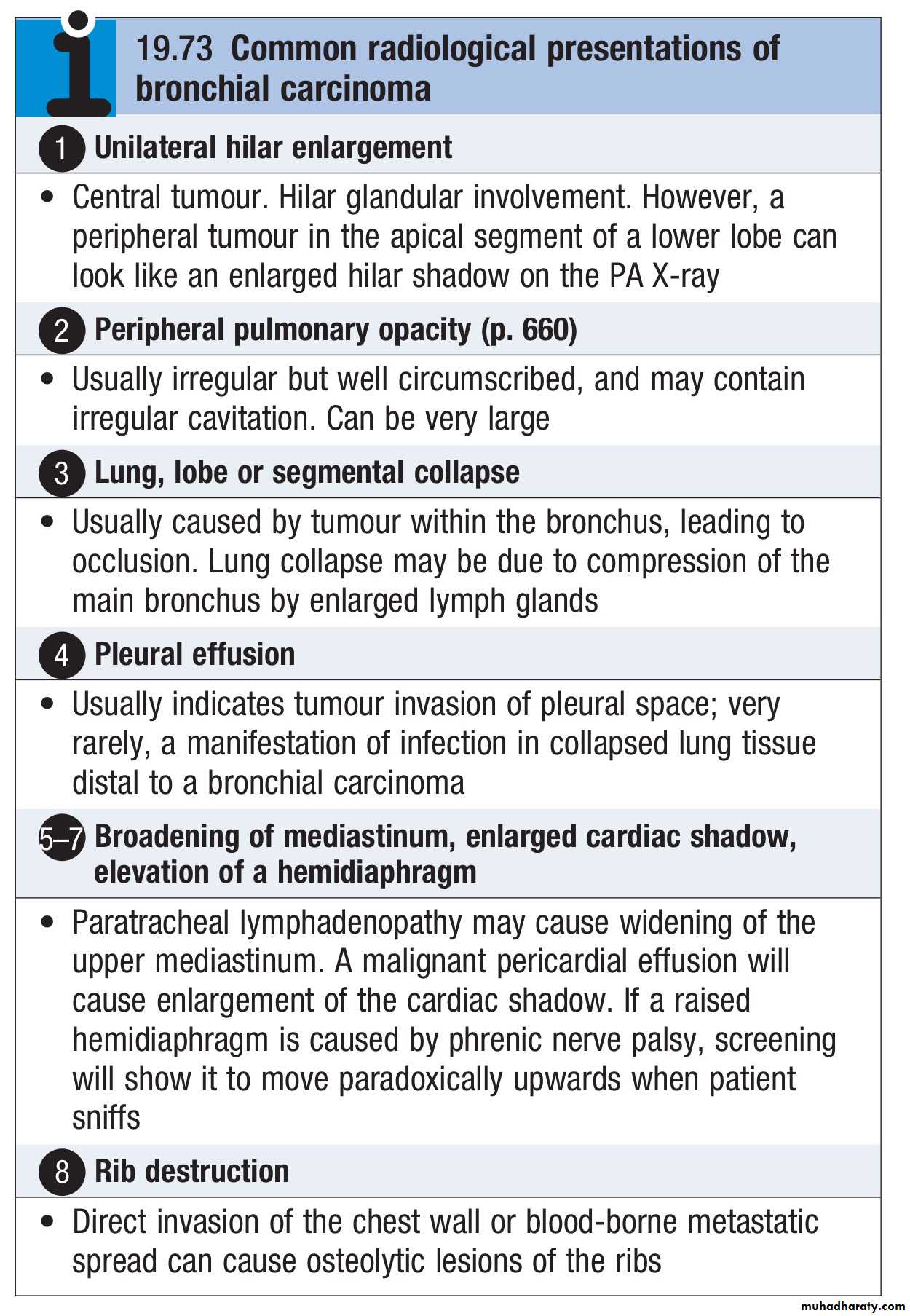 Bronchial carcinoma produces a range of appearances on chest X-ray, from lobar collapse to mass lesions, effusion or malignant rib destructionCT should be performed early as it may reveal mediastinal or metastatic spread and is helpful for planning biopsy procedures