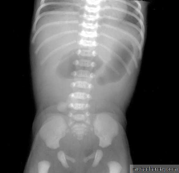 X-ray show double bubble appearanceDifferential diagnosis:-1-Doudenal atresia2-Malrotation with volvulus