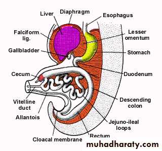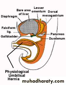 As a result of rapid growth and expansion of the liver, the abdominal cavity temporarily becomes too small to contain all the intestinal loops.
