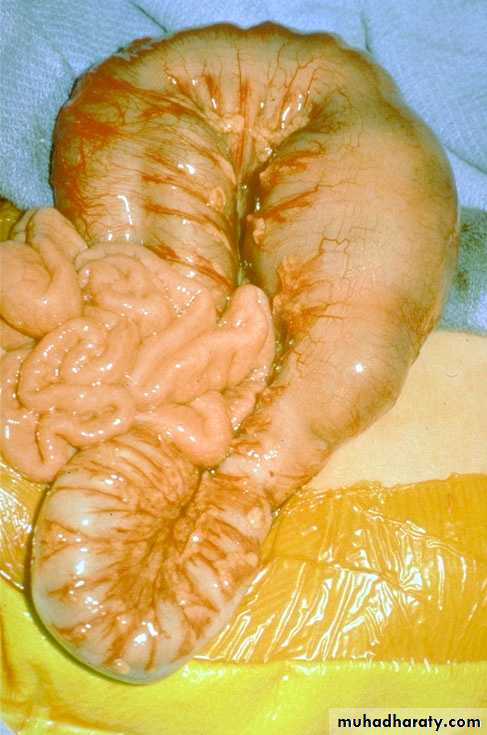 2-50% are complicated and associated with volvulus, atresia, Intestinal perforation causing meconium peritonitis .