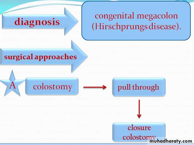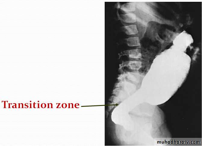 Diagnosis:Barium enema will reveal a transition zone with narrow segment and dilated proximal portion. Late films will show retention of barium at 24- 48 hours.