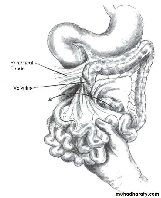Lack of retroperitoneal fixation of bowel and presence of Ladd’s bands