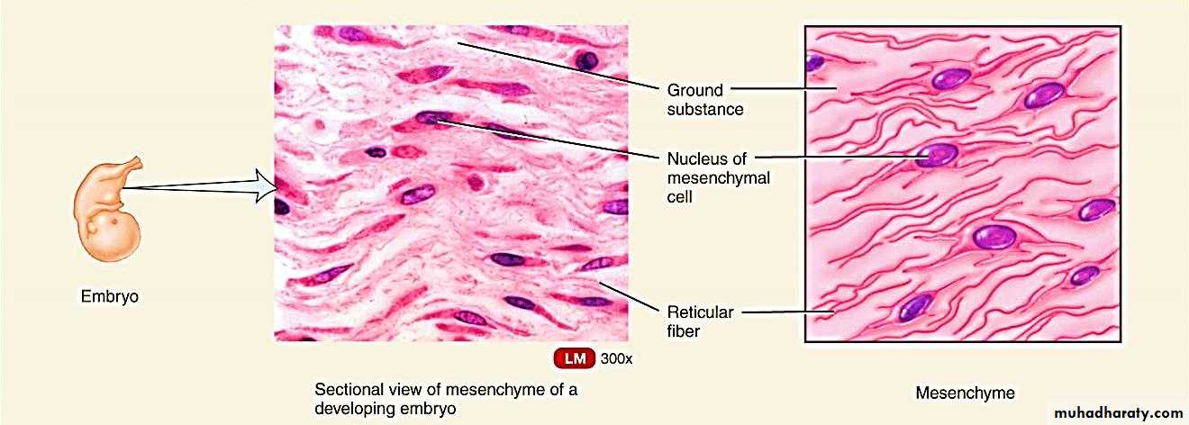 Mesenchymal connective tissue: is the connective tissue of embryo, consists of mesenchymal cells in a gel – like amorphous ground substance containing scattered reticular fibers.