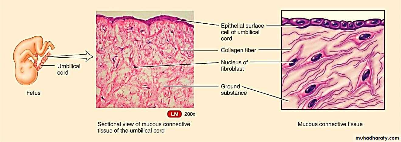 Mucous connective tissue: it is found in umbilical cord, it contains fibroblasts, few macrophages and some lymphocytes. The ground substance is soft and jelly like containing fine collagenous fibers.