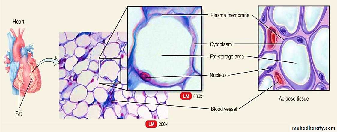 The cells of adipose (fat) tissue are characterized by a large internal fat droplet, which distends the cell so that the cytoplasm is reduced to a thin layer and the nucleus is displaced to the edge of the cell. These cells may appear singly but are more often present in groups . When they accumulate in large numbers, they become the predominant cell type and form adipose (fat) tissue. Adipose is widely distributed in the body, especially under skin and around internal organs.Reticular tissue: