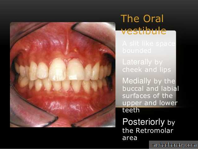 1- Vestibule:- slit-like space between lips/cheeks and teeth/gingivae (gums).