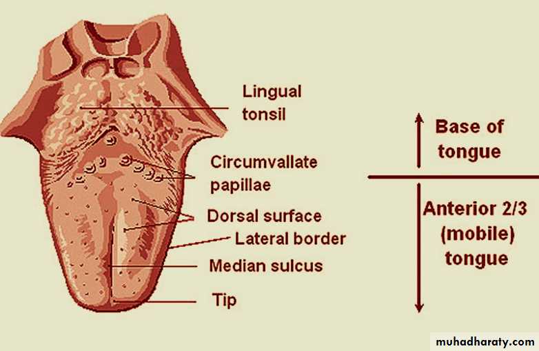 1- Oral part (anterior 2/3 body);- the mobile part