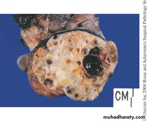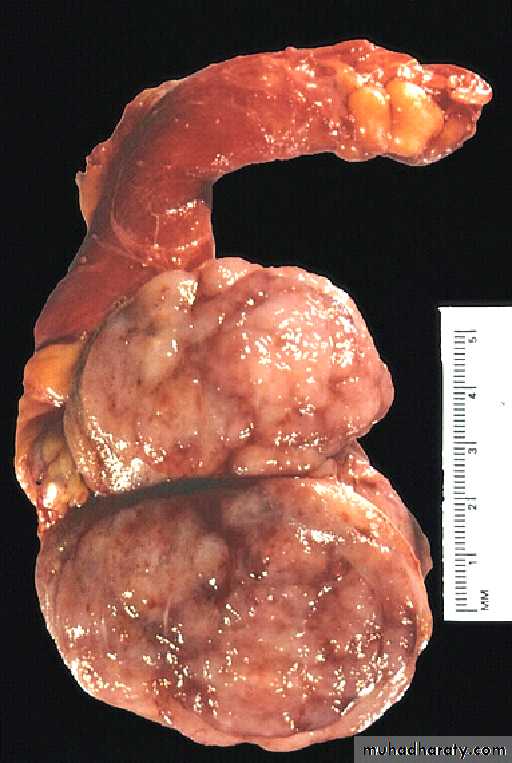 Spermatocytic seminoma: - about 5% of all seminomas. It arises in older patients (more than 50 years). On gross examination the size of the tumor is variable may reach 15 cm. the tumor is poorly demarcated soft yellow gray, gelatinous with small cystic areas. Histologically:- the tumor is composed of three population of neoplastic cells 1) small cells,
