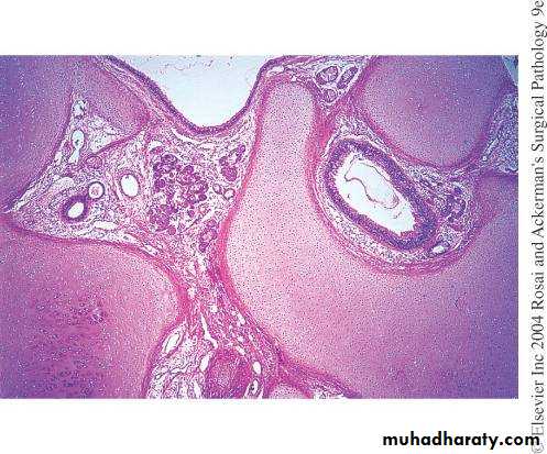 Large islands of cartilage are seen surrounding well-differentiated glandular structures.