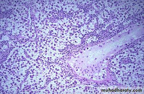 A small rim of remaining normal testis appears at the far right. The tumor is composed of lobulated soft tan to brown tissue.Histologically: solid nest of proliferating tumor cells in between there is randomly scattered thin fibrovascular trabeculea. The tumor cells have well defined borders with clear cytoplasm. The nuclei show limited pleomorphism and coarse granular chromatine. Typically there is lymphocytic infiltration is present in the fibrovascular trabeculea. Radiotherapy results in 5- years’ survival in 85-90%.
