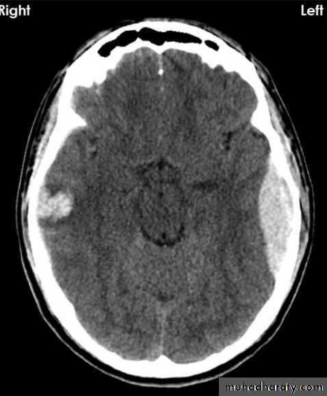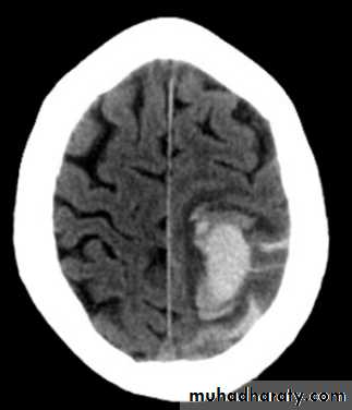 Hyper density area, 50-70 HU, due to the clotted blood, elliptical in shape, no edema around the lesion, but may cause shifting of the midline, or compression of the ipsi lateral ventricle if it is large enough.