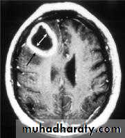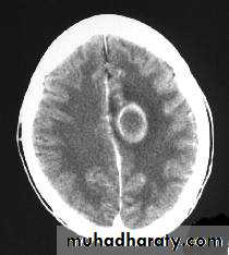 CT finding :Hyper dense area , surrounded by edema , any where within the brain parenchyma.