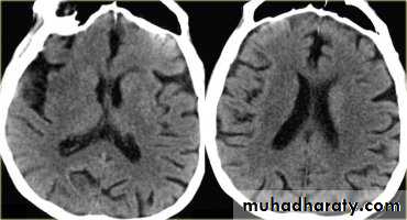 Atrophy of the brain tissues with subsequent loss of volume & dilatation of the ventricular system .