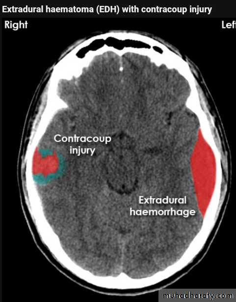 The source of bleeding of the haematome is injured middle meningeal artery so the lesion > 90 % associated with skull # at the site of the previous mentioned artery.