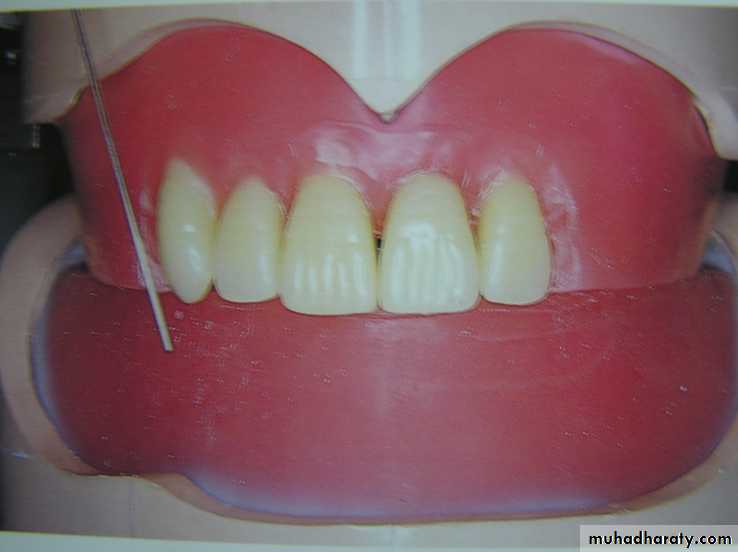 The central incisor is placed with its neck depressed and the tooth will show that it’s labially inclined when viewed from one side.